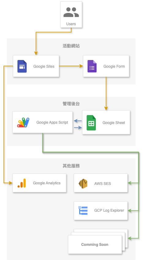 - 活動網站、報名表單、後台管理、信件通知、報到模組,通通有