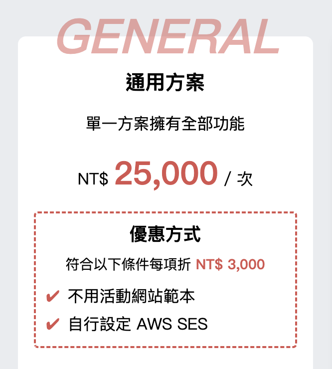 我們正在概念驗證 (PoC) 階段,特別推出 限量 3 名 $5,000 超值優惠,讓你搶先體驗高品質的活動報名後台!名額額滿後,需等到通用方案正式上線才會開放申請。